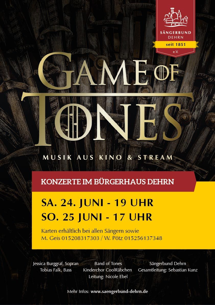 Am Samstag, 24. Juni um 19:00 Uhr startet die Premierenvorstellung im Bürgerhaus in Dehrn. Am Sonntag, 25. Juni um 17:00 Uhr folgt dann das 2. Filmmusikkonzert im Bürgerhaus. Das ganze Bürgerhaus wird mit großem Aufwand in ein Kino umgewandelt. Auf einer 5 x 2,50m großen LED-Wand werden die musikalischen Beiträge des Chores, der 8-köpfigen Band sowie den bekannten Solisten Jessica Burggraf, Sopran und Tobias Falk, Bass, mit Beiträgen stimmungsvoll untermalt. Im Foyer kann man sich mit selbst hergestelltem Popcorn oder Tachos und kühlen Getränken stärken.