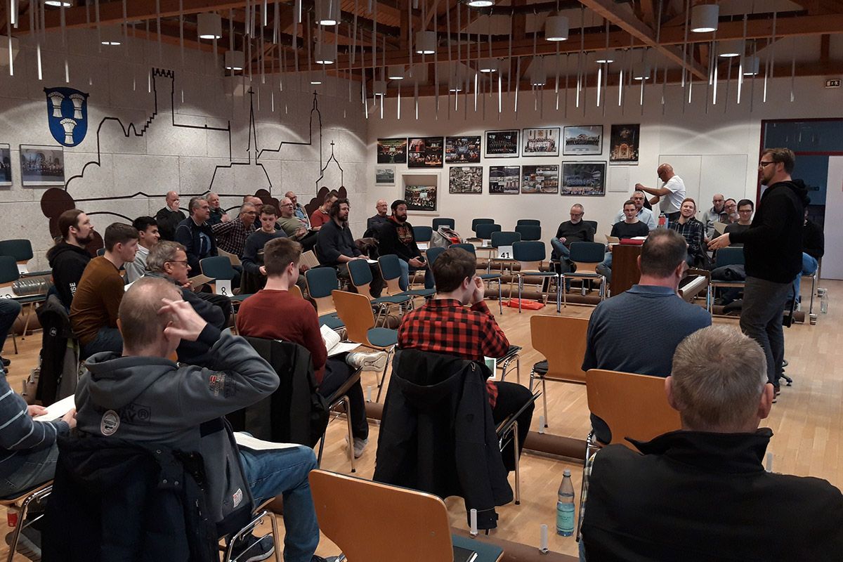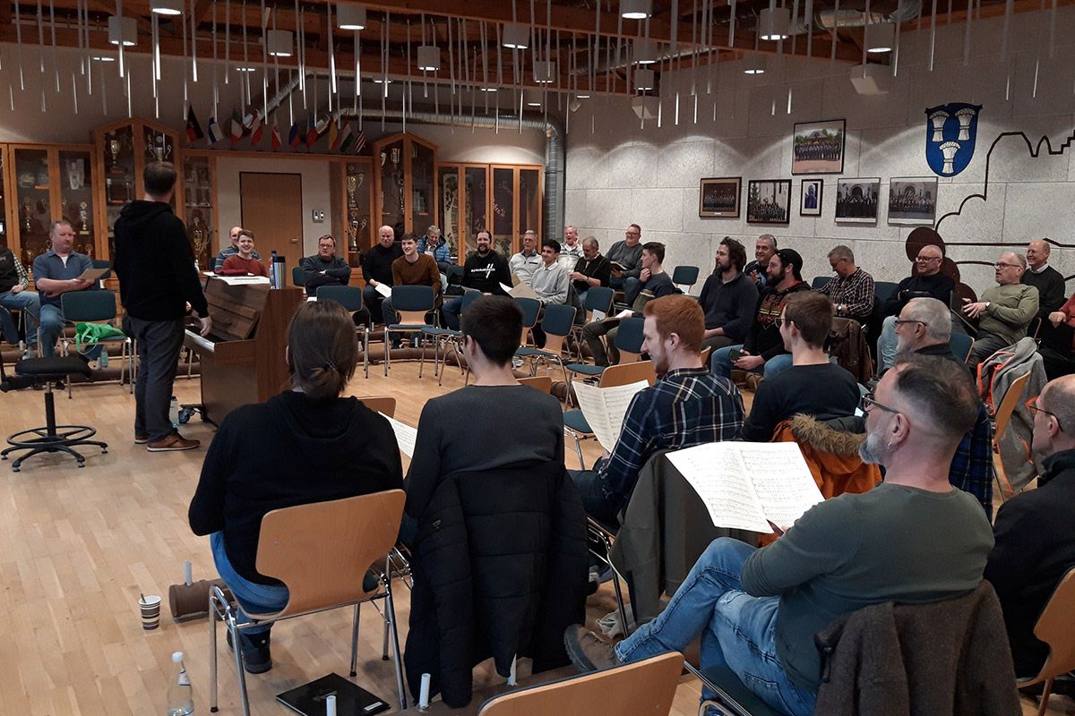 54 Sänger haben in zwei Proberäumen des Bürgerhauses und Feuerwehr- und Vereinshauses in Dehrn unter der Leitung ihres Chorleiters Sebastian Kunz und mit professioneller Unterstützung durch die Chorleiter Frank Hilgert neue Männerchorliteratur einstudiert.