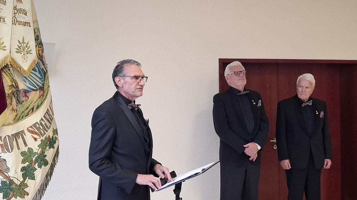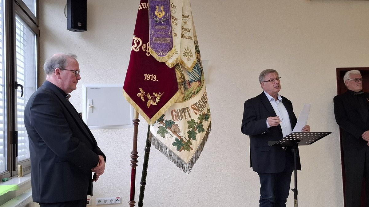 Nach dem Gottesdienst begrüßte der 1. Vorsitzende Markus Geis die anwesenden Sänger, Gäste und Ehrengäste, darunter Stadträtin Carina Heun in Vertretung der Bürgermeisterin, Ortsvorsteher Bernd Schäfer und Sängerkreisvorsitzender Gerhard Voss. In ihren Grußworten hoben sie das Engagement des Vereins hervor, der mit seiner Musik über Jahrzehnte hinweg das kulturelle Leben der Stadt bereichert.
