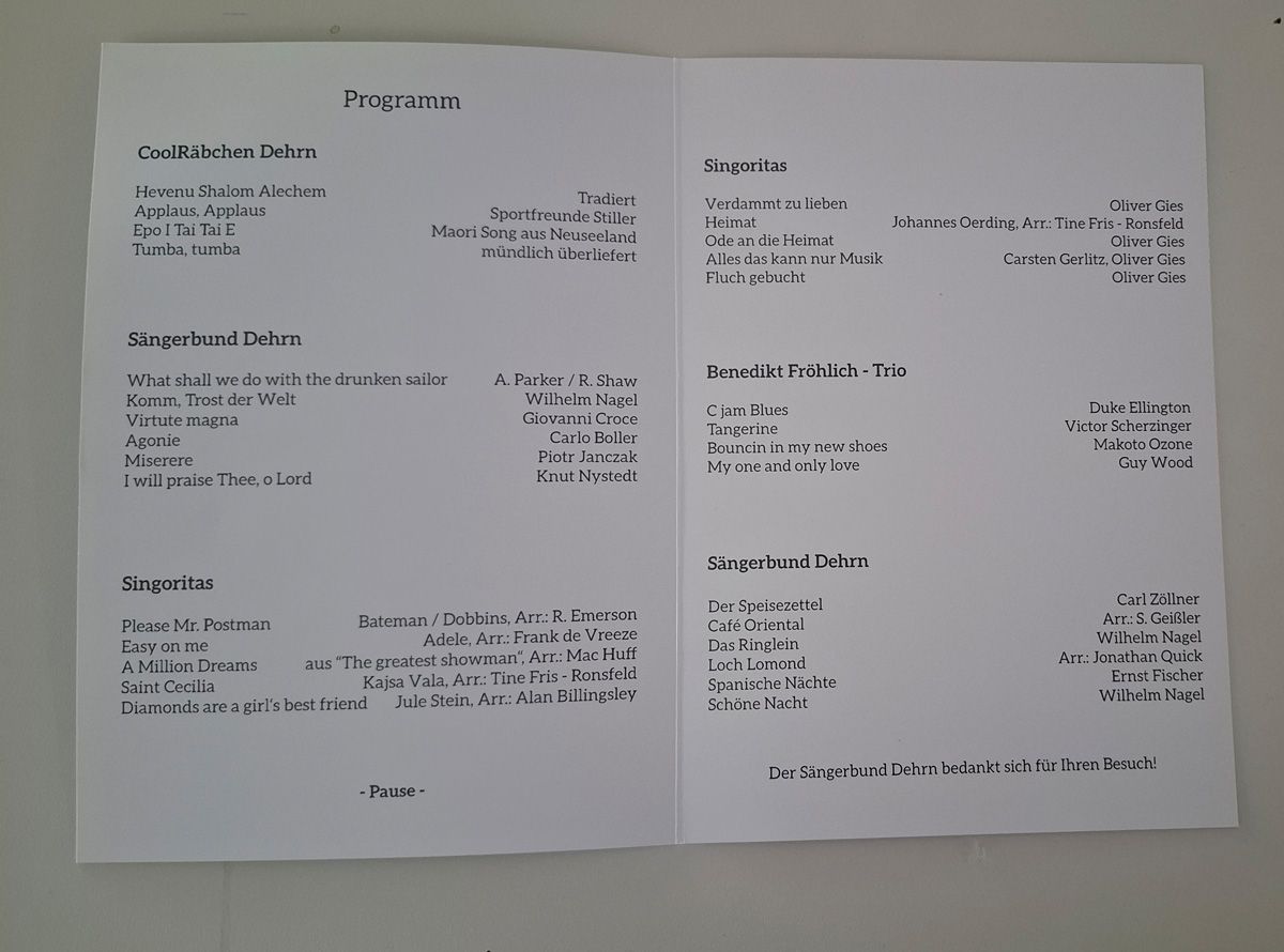 Den Ausklang gestaltete erneut der Sängerbund, diesmal mit modernen und anspruchsvoll arrangierten Stücken wie „Café Oriental“, „Loch Lomond“, „Spanish Eyes“ und „Down by the Riverside“. Das Publikum zeigte sich begeistert und verabschiedete die Sänger mit lang anhaltendem Applaus.