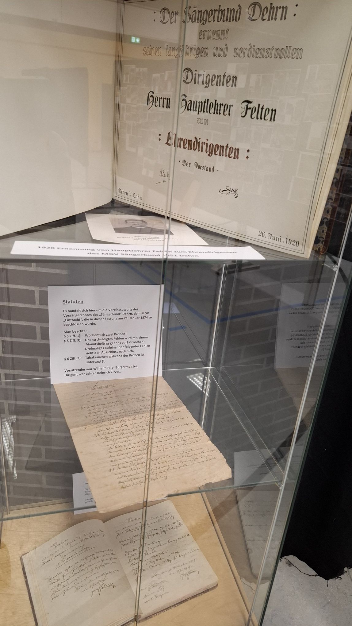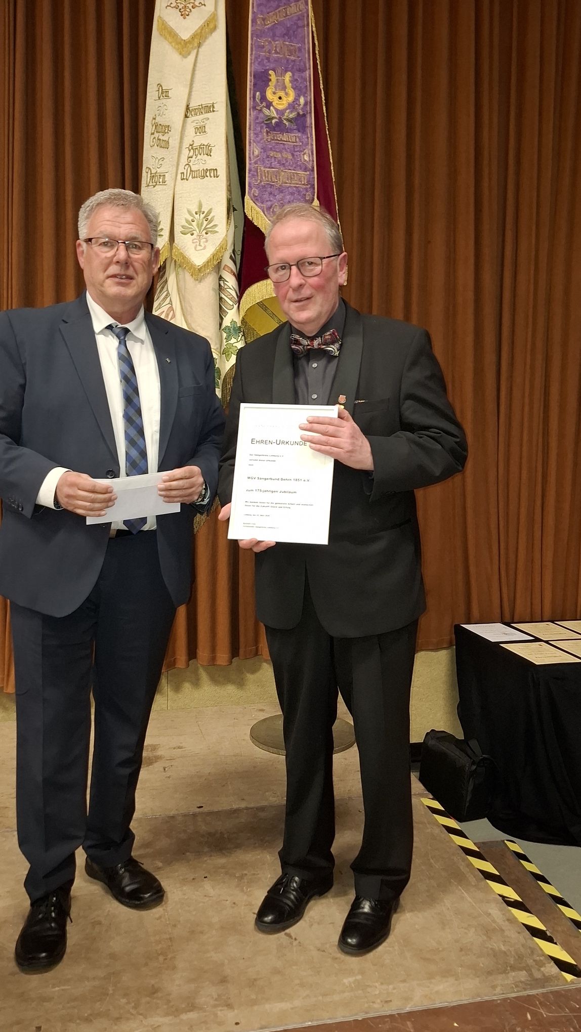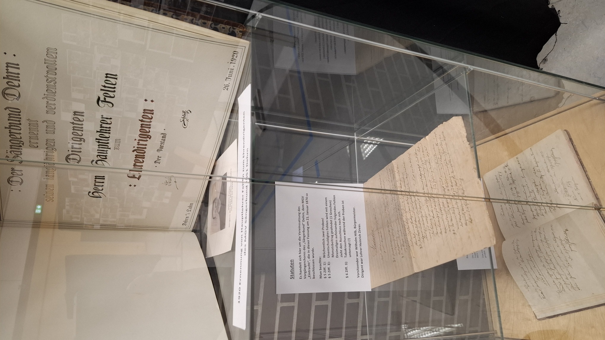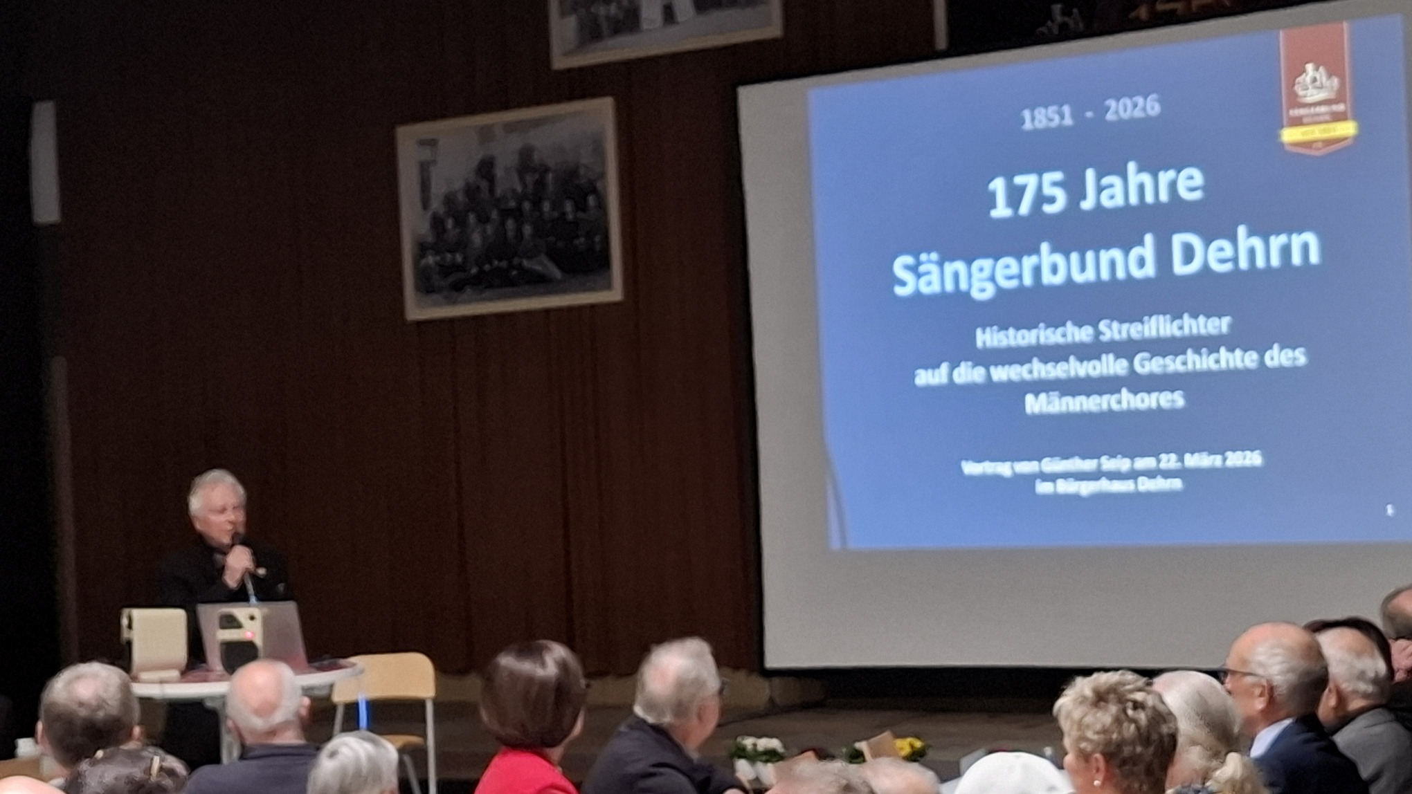 Am 22. März folgte die Jubiläumsfeier mit zahlreichen Gästen und einem abwechslungsreichen Programm. Im Mittelpunkt stand eine umfangreiche Ausstellung zur Vereinsgeschichte mit historischen Dokumenten und Exponaten, darunter eine Gründungsurkunde von 1919 sowie ein Chorstatut aus dem Jahr 1875. Ergänzt wurde dies durch eine Präsentation von Günther Seip, der die 175-jährige Entwicklung des Sängerbundes anschaulich darstellte.