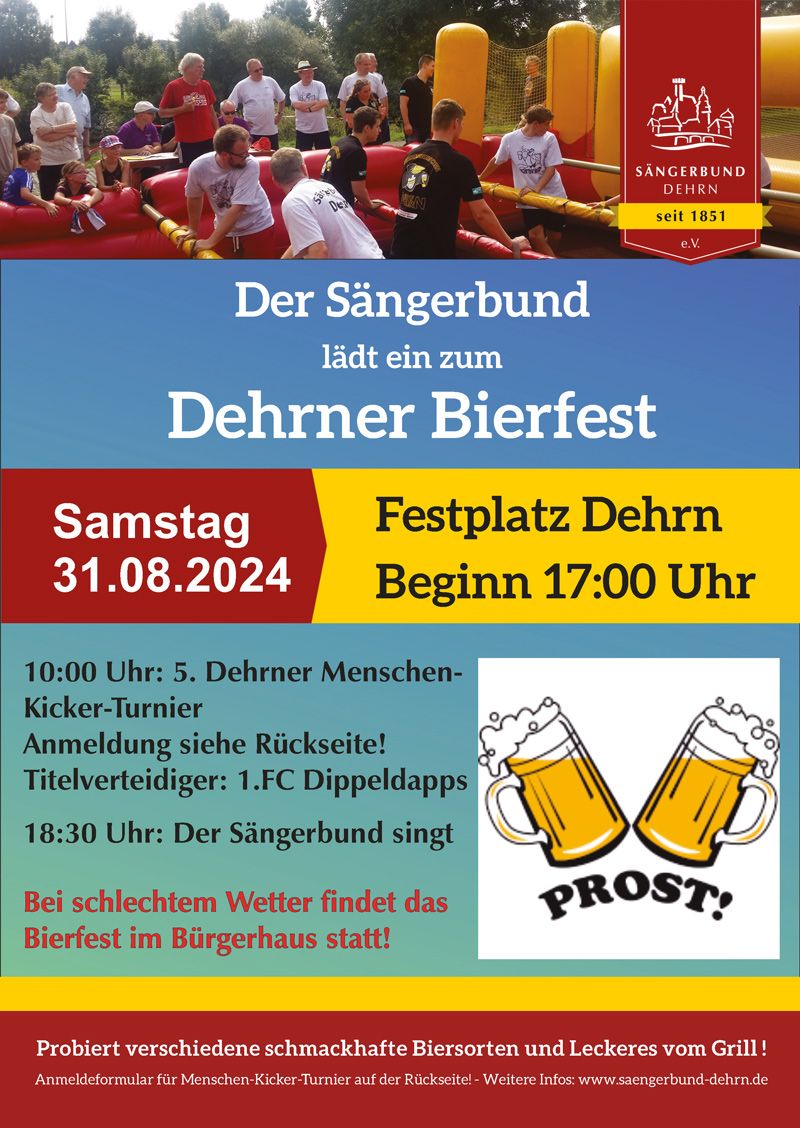 Der Männergesangverein „Sängerbund“ hat mit seinem erneuten Bierfest und Menschen-Kicker-Turnier in Dehrn viele Zuschauer und Teilnehmermannschaften angelockt. Gleich sechs Teams trugen sich in die Teilnehmerliste ein, um die begehrten Preise zu gewinnen.