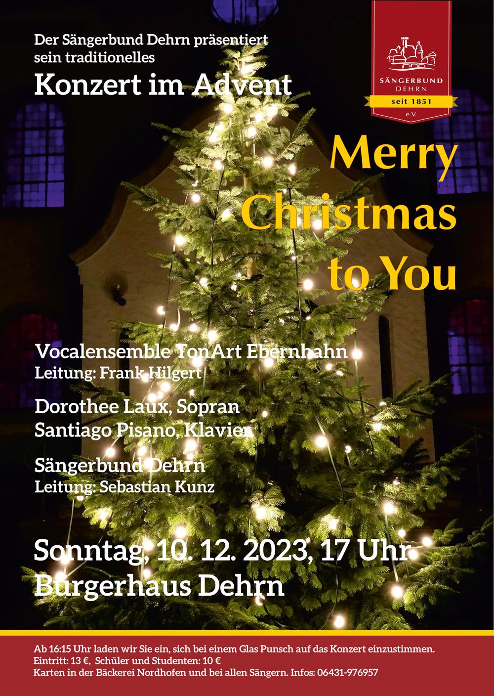 Am 10. Dezember veranstaltet der Sängerbund Dehrn wieder sein traditionelles Konzert im Advent unter dem Titel „Merry Christmas to you“. Das Konzert beginnt um 17:00 Uhr im Bürgerhaus in Dehrn.