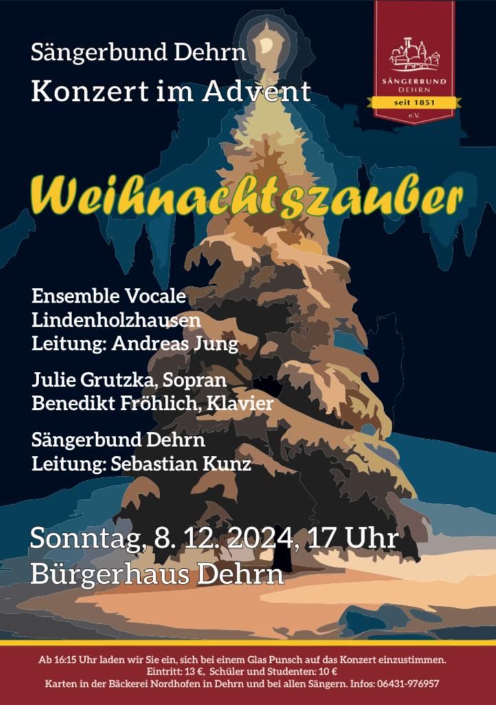 Am Sonntag, den 8. Dezember veranstaltet der Sängerbund Dehrn wieder sein traditionelles Konzert im Advent unter dem Motto „Weihnachtszauber“. Das Konzert beginnt um 17:00 Uhr im Bürgerhaus in Dehrn.